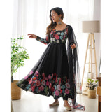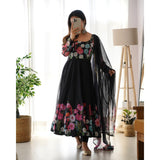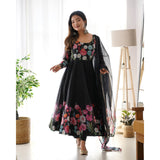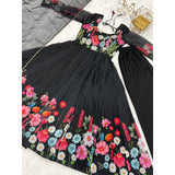 Black Color Pure Soft Organja Silk Fabric Fully Flair Kali Pattern And Canvas Patta With Dupatta Set Pent Ready To Wear