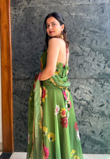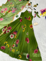 Fancy Neck Pattern Green Color Flower Printed Anarkali Gown