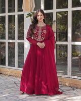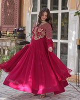 Rani pink color faux blooming georgette gown with embroidered dupatta