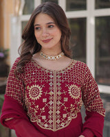 Elevate your wardrobe with this exquisite rani pink gown crafted from faux blooming georgette, offering both elegance and comfort. The gown features intricate sequins and zari embroidery work, a flattering V-neckline, and full sleeves, exuding sophistication. Accompanied by a matching dupatta adorned with rich sequins and embroidered lace border, this ensemble is perfect for festive occasions and celebrations, seamlessly blending traditional charm with contemporary style.