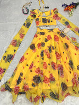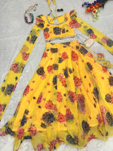 Fancy Sleeves Pattern Flower Print Yellow Lehenga Choli