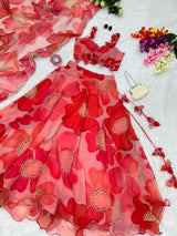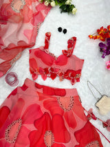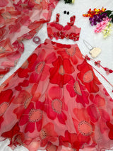 Fashionable Moti Work Flower Print Red Color Lehenga Choli
