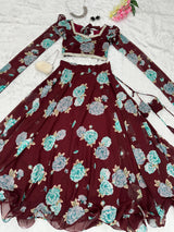 Fancy Sleeves Pattern Flower Print Maroon Lehenga Choli