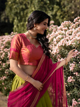 - Kanchipuram zari weaving work pista color lehenga choli is a traditional south Indian outfit known for its rich fabric, intricate weaving, and luxurious design.