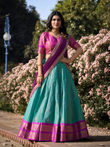 • Kanchipuram zari weaving work sky blue color lehenga choli is a traditional south Indian outfit known for its rich fabric, intricate weaving, and luxurious design.