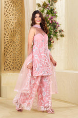 Party Wear Blush Pink Trending Halter Neck Kurta And Plazzo Set Dupatta In Butterfly Net With Sequence Embroidery Work