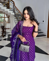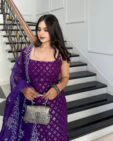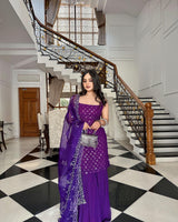 Make a royal statement with this elegant Royal Purple Embroidered Kurti Sharara Suit Set with Dupatta. Crafted in rich fabric and adorned with delicate embroidery and mirror work, this traditional ensemble features a flared sharara bottom, a beautifully detailed kurti, and a matching dupatta with scalloped edges. Perfect for weddings, festive occasions, or sangeet nights, this designer sharara suit blends ethnic charm with regal flair. Style it with statement earrings and a clutch for a complete glam look.