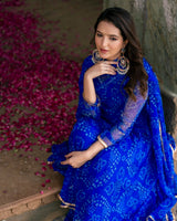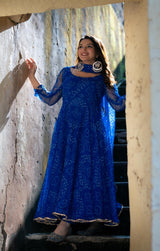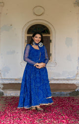Digital Print Blue Colour organza silk Anarkali Suit Set with huge flair